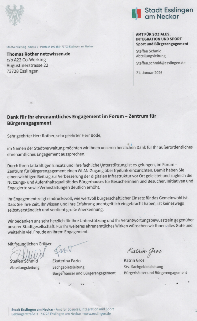Ein Dankeschön von der Stadt Esslingen von FFES admin | Feb. 6, 2026 | Allgemein … und ein Dankeschön zurück für die Wertschätzung unserer Arbeit!
